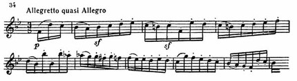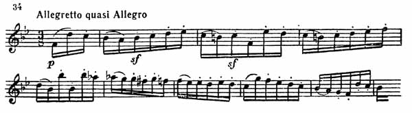 Однако меланхолия не к лицу юности, для которой открыт весь мир с его радостями и надеждами, а потому отбросим все мрачное и будем резвиться и танцевать! И вот во исполнение этого призыва после последнего глубокого вздоха Бетховен неожиданно переключает слушателей в шутливо-веселую часть (Allegretto quasi allegro, 3/8, четверть с точкой = 48) танцевального характера (пример 34).