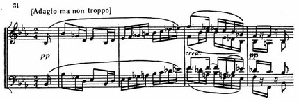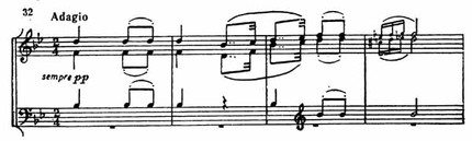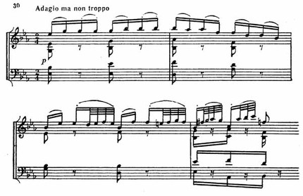 Большой любовью у слушателей пользуется вторая часть (Adagio ma non troppo, 2/4, шестнадцатая = 80). Это спокойная, пленительная музыка, развивающаяся в лирическом плане (см. пример 30).