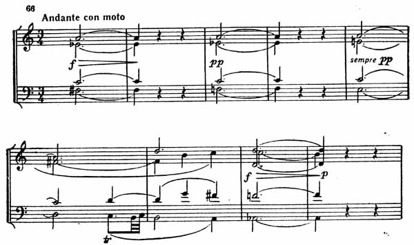 Начиная с первых аккордов, далеких от основной тональности, гармония движется как бы ощупью в глубокой темноте (пример 66).