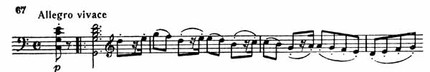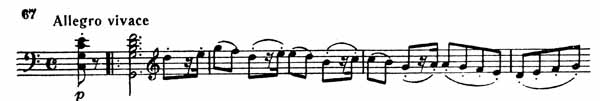Затем тихо вступает сонатное allegro (Allegro vivace, 4/4, половинка = 88). Тема главной партии излагается первой скрипкой (пример 67).