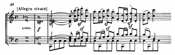 Но скоро он освобождается от этого настроения, ритм становится более напряженным, все более возрастает сила звука, и у первой скрипки в свободном варьировании сначала шестнадцатыми, затем триолями в характере речитатива появляется начальная тема Allegro vivace, знаменующая начало репризы.