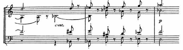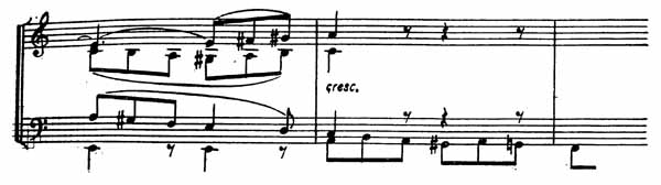 Далее во всех инструментах продолжается указанное в последнем примере движение, но все тише и тише, и незаметно вторгается чудесная певучая мелодия, которая приобретает грустный характер, как будто композитор отдался воспоминаниям прошлого и вместе с тем в этой грусти находит утешение.