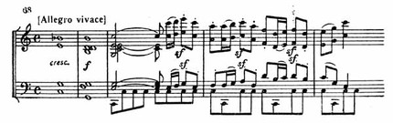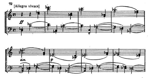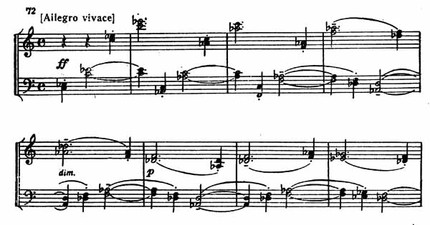 После этого бурно врывается F-dur, и с огнем и блеском снова воцаряется тема побочной и далее связующей партий. Их развитие приводит к кульминации разработки (пример 72).