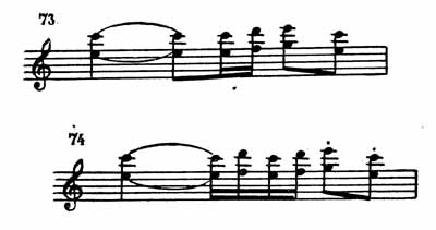 Она существенно отличается от экспозиции. Прежде всего композитор старается, видоизменив ритм, придать больший блеск «мотиву триумфа». Из характерной фигуры экспозиции (пример 73) получается ее вариант (пример 74), и этот оборот последовательно разрабатывается. В музыке чувствуется большая энергия. Реприза заканчивается оживленно и блестяще.