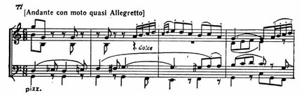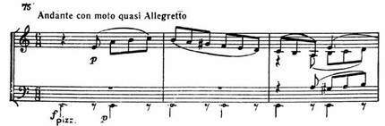 Andante начинается глухими ударами pizzicato у виолончели, к которым остальные три верхних голоса совсем тихо присоединяют свою песнь (пример 75).