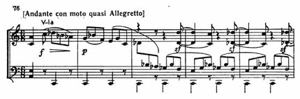 В звуках этой песни слышится жалоба, пришедшая, чтобы растрогать чужие сердца. Ко второй теме ведут свободные преобразования первой темы у альта (пример 76).
