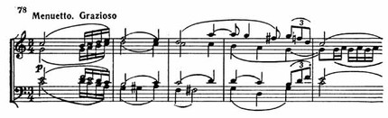 Учитывая впечатление от трагического Andante, Бетховен, по-видимому, решил, что следующая часть должна быть отдохновением от волнений, пережитых во второй части, и сочинил грациозную третью часть — менуэт (Menuetto grazioso, 3/4, четверть = 116). Этот менуэт (пример 78) далек от менуэтов Гайдна и более напоминает старинный французский менуэт.