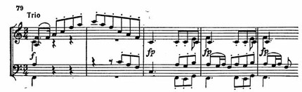 В том же игривом, несколько даже капризном стиле и с тем же оживлением, которым характеризуется второй раздел менуэта, звучит и его трио в F-dur (пример 79).