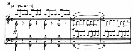 К альту далее присоединяются вторая скрипка, виолончель и наконец первая скрипка, которая занимает ведущую роль в создании бурного движения всех голосов, приводя к властной по характеру, мощно звучащей кульминации (пример 81).