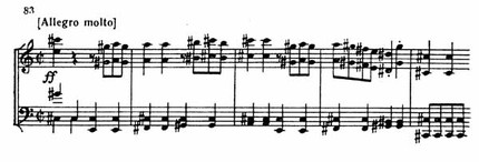 В построении E-dur средние голоса сливаются во встречном движении, как атлеты в единоборстве, и при драматическом повороте в f-moll появляется на арене настоящий герой — первая скрипка. Затем упрямо и непреодолимо обе скрипки подхватывают видоизмененную тему главной партии (пример 83).