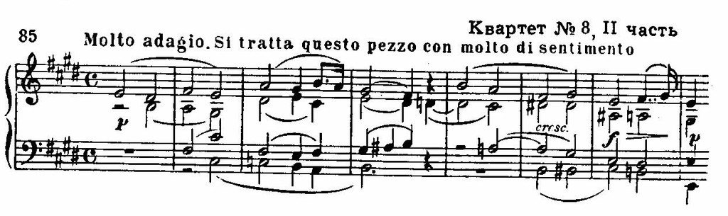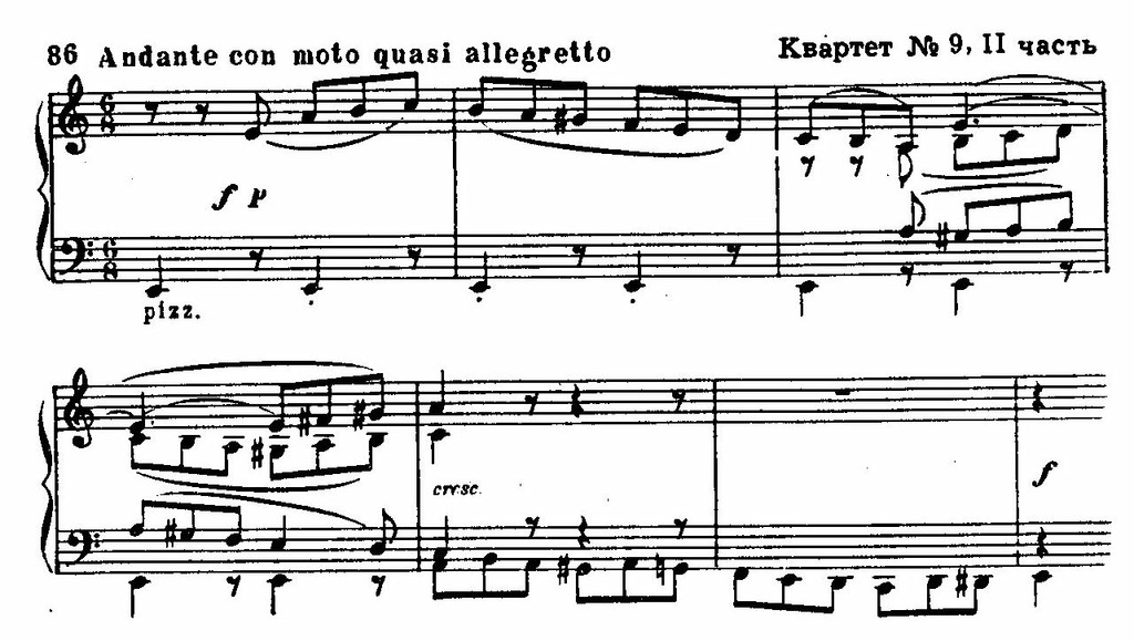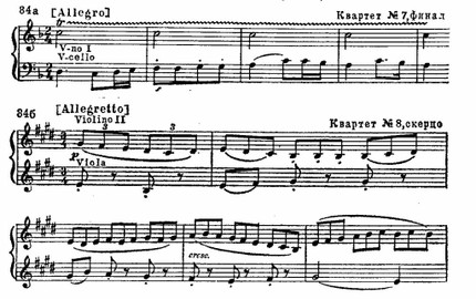 Рождение нового стиля знаменуется появлением в 1806 — 1807 годах opus’a 59, посвященного русскому послу в Вене графу Разумовскому и содержащего три квартета (по общей нумерации — 7, 8, 9). Они приходятся на тот поразительный по творческой вдохновенности период, с которым связаны «Аппассионата», Пятая симфония, «Кориолан». Бетховен использовал здесь темы русских народных песен, взятых из сборника Львова — Прача «Ах талан мой, талан» (финал Седьмого квартета) и известную мелодию «Славы» (трио из скерцо Восьмого квартета):