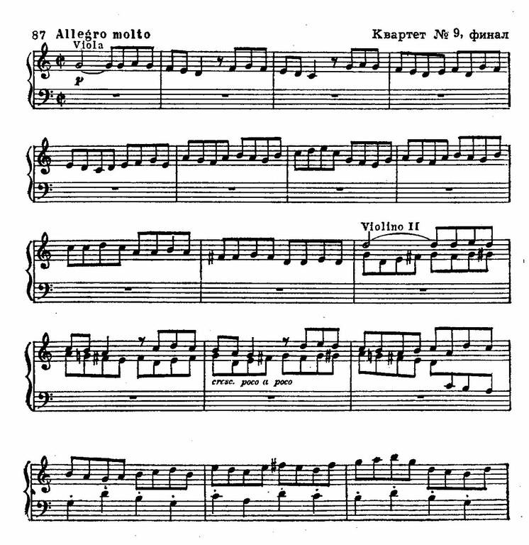 В Девятом квартете (C-dur) преобладают скерцозно-юмористические тона; внутренним контрастом служит медленная созерцательная часть, которой свойственна редкая красота. По своей льющейся мелодичности, эмоциональной непосредственности она перекликается с будущими лирическими миниатюрами романтиков: