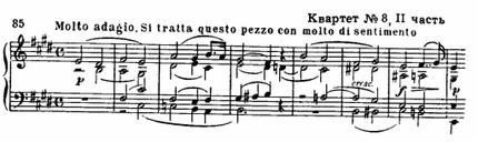 На протяжении всего квартета интенсивная тревожная мысль (связанная со сферой главной партии) непрерывно вытесняет образы идеальной гармонии. Так, во второй части первая, прекрасная песенная тема, полная глубокого радостного раздумья, вскоре сменяется напряженно звучащим фугированным развитием: