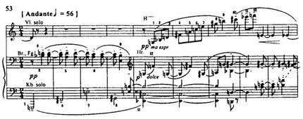Серия Скрипичного концерта (пример 53) представляет собой ярко характерную последовательность звуков: восходящий терцовый ряд обрисовывает четыре разных трезвучия, два минорных и два мажорных, и замыкается характерным для Берга целотонным отрезком – из четырех звуков; с подобного же отрезка начинается мелодия хорала Баха «Es ist genug».