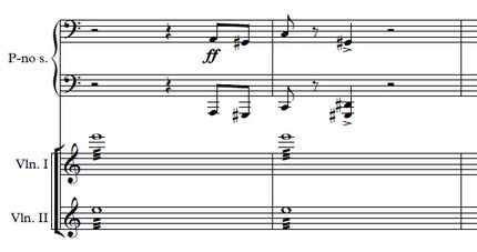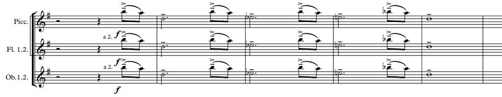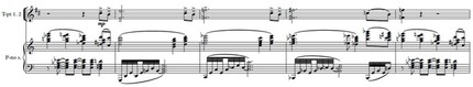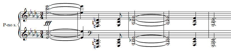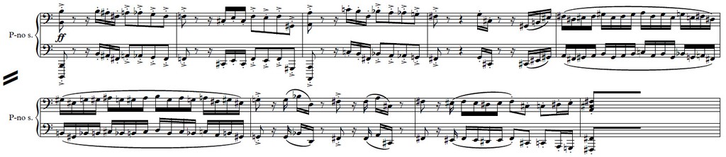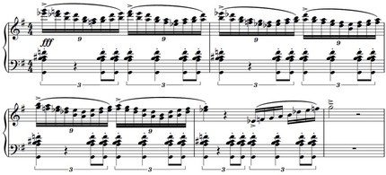 Интенсивное динамическое развитие достигает зловещей кульминации (пример 6), за которой, как следствие, - безысходное горе и страдание (пример 7).
