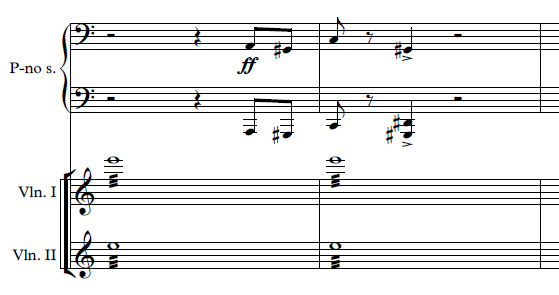 Первая часть Fantasia Concertante «Genesis» состоит из двух разделов, неравнозначных как по масштабам, так и в смысловом отношении [8]. Первый выполняет функцию своего рода увертюры, экспонируя основные образы произведения – лейтмотивы сотворения мира и человека и темы разрушения. Он соответствует первой части симфонической поэмы, скорректированной такими принципами концертности, как импровизационность, включение монологов солирующего фортепиано и диалогов его с оркестром. Разумеется, значительно расширена партия фортепиано и усилена её виртуозность.