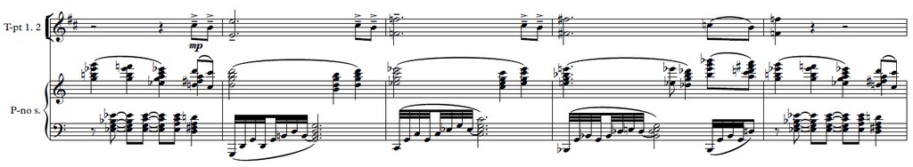 Волновое развитие экспозиционного раздела (тема излагается у фортепиано соло, затем более динамично у оркестра, и снова, с увеличивающимся натиском, у фортепиано с малым барабаном) подводит к кульминационной зоне, которая также представляет три волны нарастания, но уже на следующем, более жестком варианте исходного мотива:
