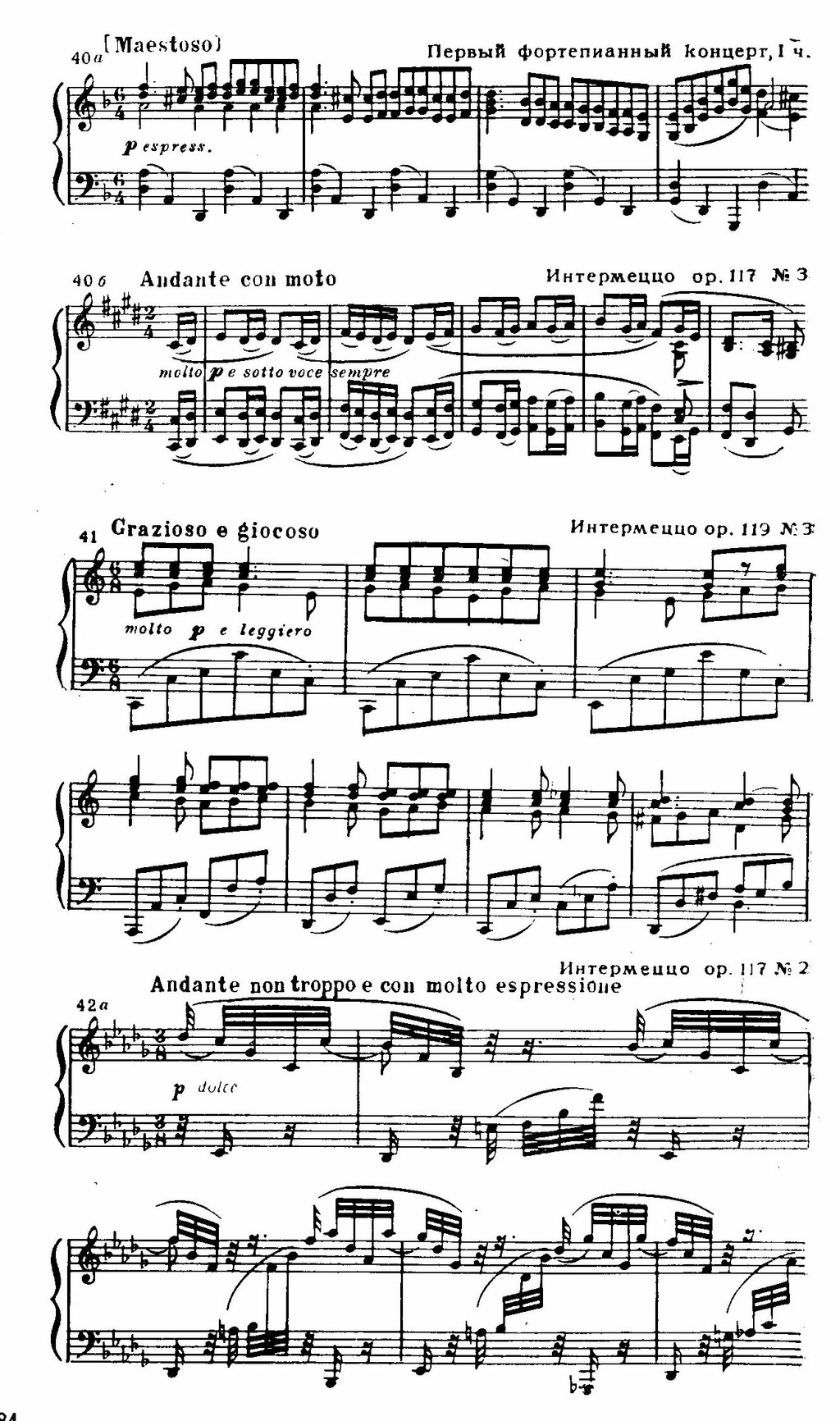 В последний период творчества Брамс переключился на камерную трактовку фортепиано. В 1892—1893 годах в четырех сборниках ор. 116—119 он опубликовал двадцать пьес (частично написанных ранее). За исключением баллады ор. 118 и рапсодии ор. 119, все это мелкие пьесы, которые Брамс наделил названиями «Каприччио» (три пьесы) и «Интермеццо» (четырнадцать пьес; им родствен «Романс» ор. 118) (До того, в 1876 году, Брамс издал четыре каприччио и четыре интермеццо в ор. 76.). Первые носят деятельный, оживленный характер; вторые проникнуты чувством сдержанной скорби или просветленной печали — они близки по духу лирико-философским песням позднего Брамса. Здесь раскрываются личные, интимные грани душевной жизни автора — это словно его «дневниковые записи», «лирические монологи». Гибкость в передаче оттенков мыслей и переживаний сочетается в них с предельным лаконизмом композиции (в интермеццо изобретательно использованы возможности простой трехчастной формы), а сложное содержание выражено скупыми средствами — прежде всего словно «говорящим» складом мелодики (см. примеры 40 б, 41, 42 а, б).
