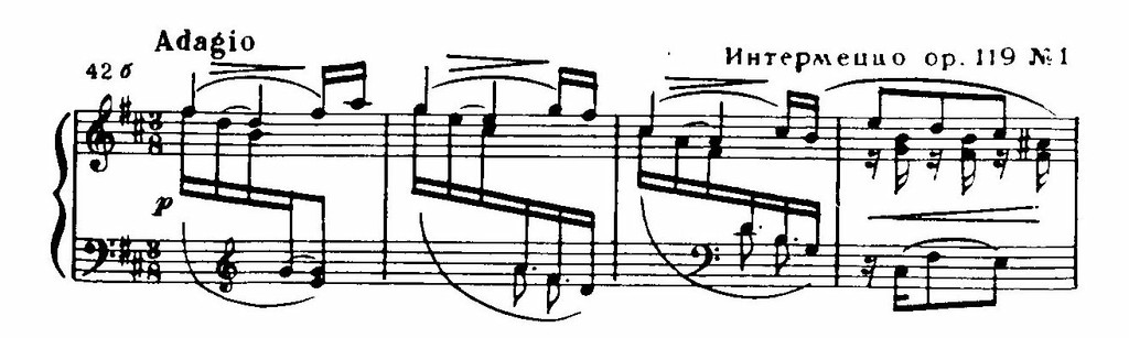 Напевными речевыми интонациями насыщены также мелодии ор. 116 № 6 (E-dur), ор. 118 № 2 (A-dur, особенно средний раздел), «Романс» ор. 118 № 5 (F-dur), ор. 119 № 3 (C-dur) и другие. Вместе с тем фортепианная фактура этих пьес сложная, многослойная, ритмы прихотливы, часты модуляционные отклонения. И как широкий вздох измученной души, на этом зыбком фоне рельефно вырисовываются выразительнейшие мелодии редкой красоты и сердечного тепла.