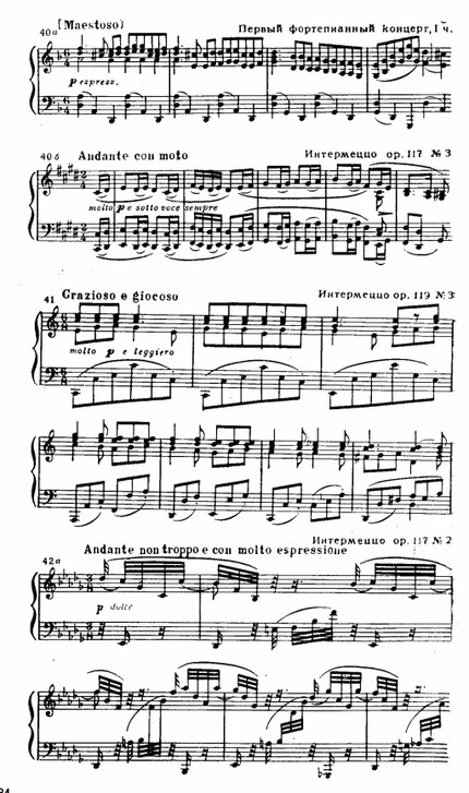 Склад пианизма Брамса наложил свой отпечаток на его фортепианную музыку. И здесь технические трудности, порой весьма значительные, возникают не для создания эффектного концертно-виртуозного «наряда», а для выражения своеобразия содержания. К числу излюбленных приемов Брамса относятся: движение параллельными интервалами в терцию, сексту или октаву (см. примеры 40 а, б); помещение мелодии в среднем голосе, что сообщает ее звучанию несколько затушеванный характер (см. пример 41); мерцающий колорит «струящихся» фигураций (см. примеры 42 а, б). В создании камерной звучности значительна также роль зыбких, сложных ритмов, которые так свойственны музыке Брамса — синкопированных, сочетающих четные метры с нечетными и пр.