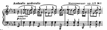 «Колыбельными своих страданий» назвал Брамс три интермеццо ор. 117. Первому из них (Es-dur) предпослан стихотворный эпиграф из шотландской народной песни: