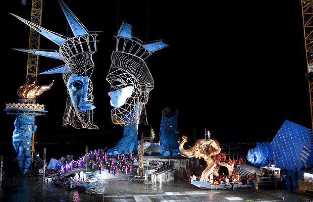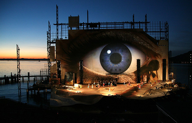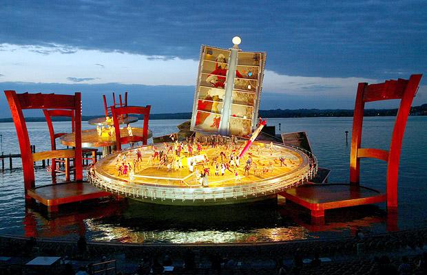 Можно только восхититься умом и привлекательным характером австрийского народа, сумевшего превратить каждый квадратный сантиметр собственной территории в нечто манящее туриста. В Брегенце это не только впечатляющие горные вершины (а, значит, зимний и летний туризм), увлекательные прогулки по озеру, богатая история и вкусная кухня, но и музыкальный фестиваль. Фестиваль разворачивается в разных местах, но площадка, которая пользуется самым большим спросом у публики,— конечно, озерная сцена. То есть вы сидите на берегу, а оперу играют на воде, на плавучей сцене. Так что спектакль рождается в единении с пейзажем.