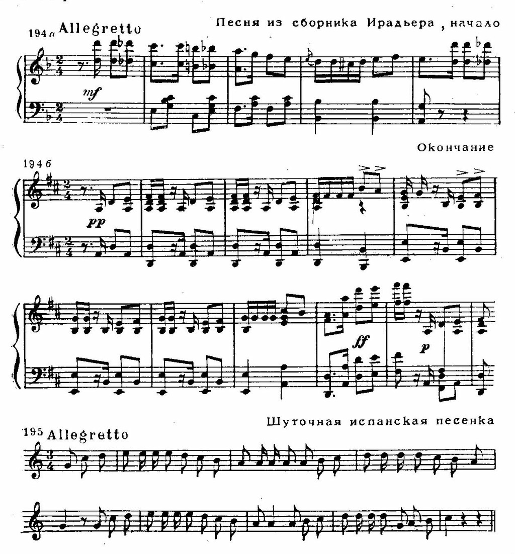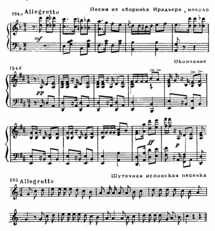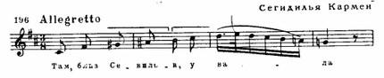 Лишь три подлинные народные мелодии использованы в партитуре оперы: это — хабанера I акта, музыка которой дает свободную обработку песенки кубинского происхождения, изданной в 1864 году в одном из сборников (см. примеры 194 а, б); поло (народный испанский танец) из оркестрового вступления к IV акту — его мелодия навеяна песней известного испанского певца М. Гарсиа (см. пример 283 в) и, наконец, мелодия дерзкого ответа Кармен Цуниге в I акте (см. пример 195), для которого либреттисты воспользовались текстом песни Земфиры из пушкинских «Цыган» в переводе П. Мериме.