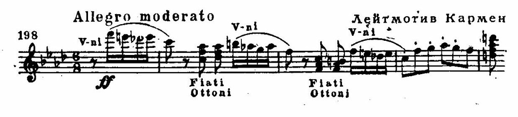 Таковы, во-первых, продуманная логика ладотонального движения; например, важное драматургическое значение во всей опере имеет драматически напряженная тональность fis-moll — она используется в сцене драки на фабрике и «отражается» в финале оперы в пониженной VI ступени Fis-dur, завершающего все произведение; не менее велико значение празднично звучащей тональности A-dur и т. д. (см. также приведенный выше анализ заключительной сцены финала). Таково, во-вторых, свободное и гибкое использование обоих обликов лейтмотива роковой страсти, темы радости любви; Гиро чутко ввел эти темы и отдельные обороты, характерные для героев оперы, в речитативы, чем еще более способствовал непрерывности музыкального развития. Таковы, в-третьих, приемы интонационно-жанрового обобщения или, шире, пользуясь терминологией Асафьева,— «драматургии интонаций», последовательно и психологически обоснованно примененные в опере.