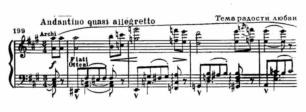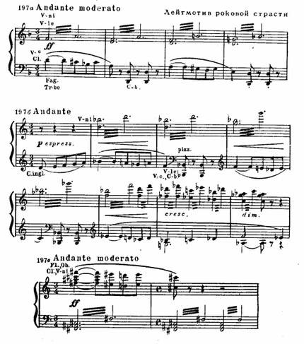Другой характер приобретает «роковая тема» в оживленном темпе ровными длительностями с акцентом на последнем звуке тетрахорда, что в размере 6/8 или 3/4 привносит черты танцевальности. Такая модификация лейтмотива связана с реальным обликом Кармен (см. ее выход в I акте):