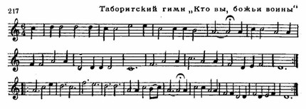 Мелодиям гуситских песен присуща тяжелая маршевая поступь, суровая монолитность образа. Таков, например, боевой гимн таборитов «Кто вы, божьи воины»: