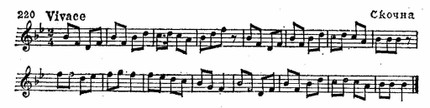 Известно пристрастие чешского народа к танцевальным движениям быстрого, стремительного характера. Двухдольный размер хорошо этому соответствует. Наиболее показательна в данном отношении «скочна», в которой подскок еще более подчеркивал бодрость, живость танца: