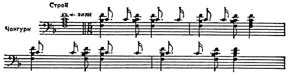 1) Грузинский 4-струнный щипковый музыкальный инструмент. Корпус — клеёный из тутового дерева (составлен из отд. клёпок), грушевидной формы, внизу усечённый. Общая дл. ок. 1000 мм. На верхней деке имеются мелкие резонаторные отверстия. Ч. — бывают с ладами и без ладов. Длинная шейка (из липы) завершается изогнутой головкой с 3 колками, к-рым крепятся 3 осн. струны из шёлковой нити; 4-я, короткая (т. н. зили; её длина — половина длины др. струн), наматывается на боковой колок, находящийся сбоку у середины шейки. 4-я струна (используется при исполнении аккордов) обычно настраивается октавой выше нижней струны. Строй зависит от лада исполняемого произв., обычно это d1 — g1 — h1 — d2, a также с1 — f1 — g1 — с2 или c1 — e1 — h1 — e2.