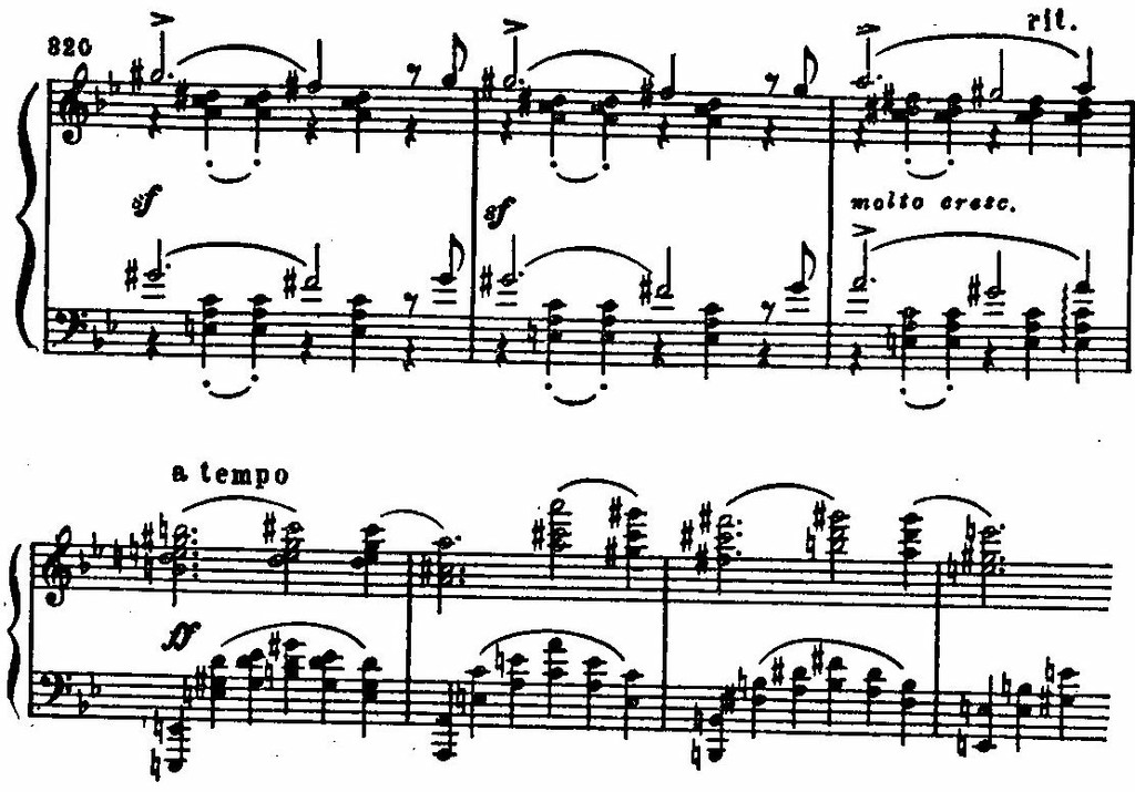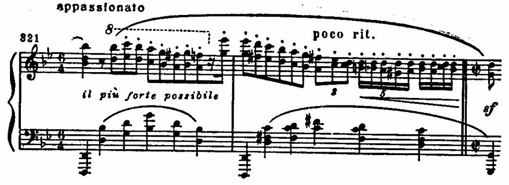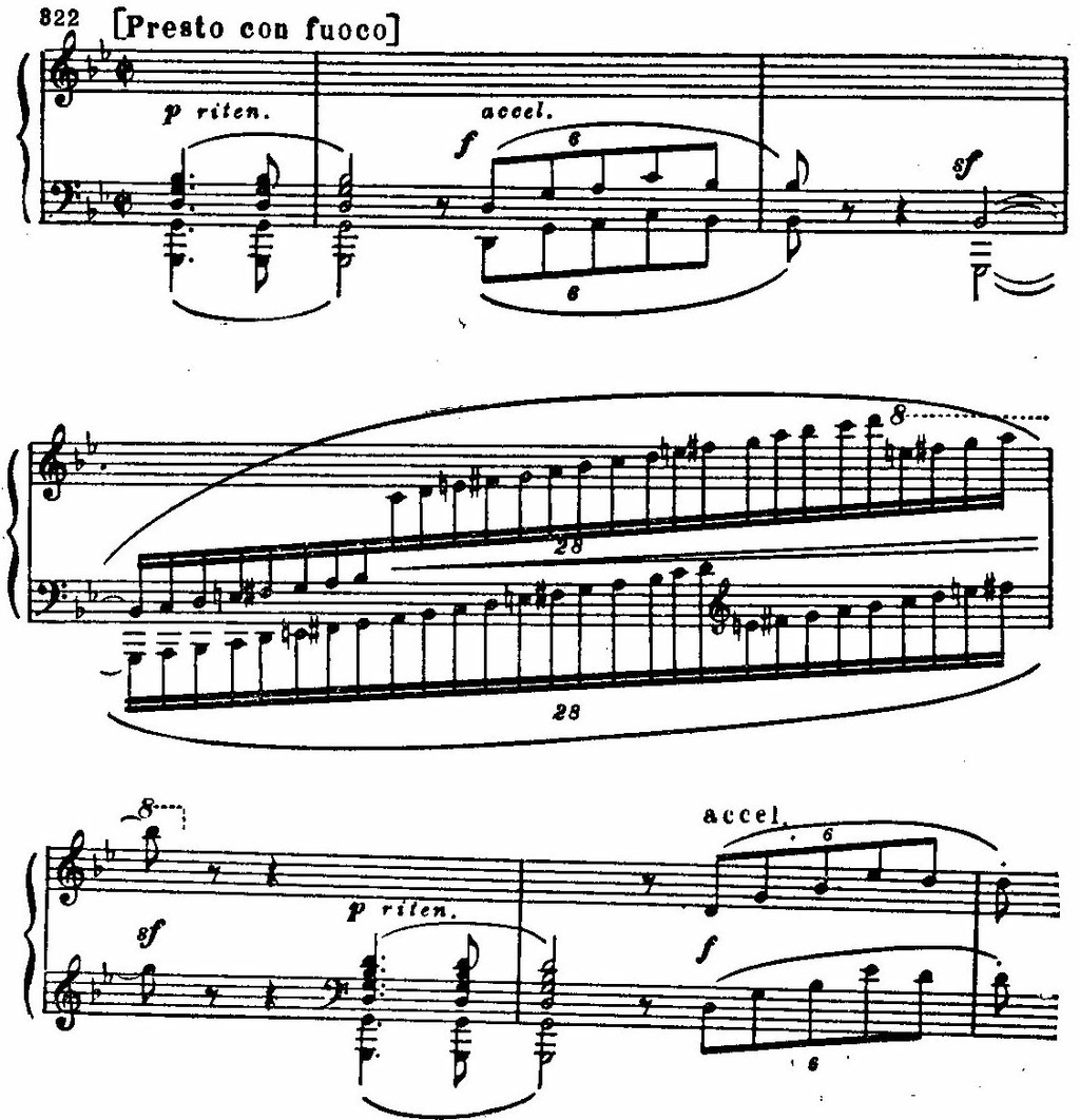 Эмоциональное напряжение драматической кульминации в коде продолжается и нарастает с неослабевающей силой. Только резкая перемена фактуры (во второй фазе коды) предвещает начало конца. Лавина гаммообразных пассажей едва сдерживается волевым напряжением пунктирно-ритмованных аккордов.