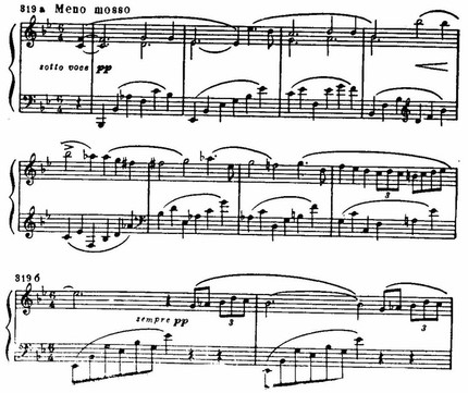 После доминантового crescendo (с новыми обыгрываниями и звонкими переборами) второй раздел баллады заканчивается переходом из соль минора в доминанту си-бемоль мажора (использовано увеличенное трезвучие), которая затухает на пустых квартах-квинтах. Должна как будто вступить вторая, B-dur'ная тема. В действительности эта тема (где особенно замечательны ласковые, „убеждающие" акценты в противоположность печальным вздохам первой темы, ритмика квазимазурки, мелодизация баса, секвенции) с самого начала стремится из B-dur в Es-dur, которого и достигает в коде „экспозиции" баллады (такты 15 и дальнейшие от начала Meno mosso). Кода завершает характер второй темы с ее спокойной песенно-речитативной лирикой. С такта 27 Meno mosso опять развивается материал первой темы — здесь уже не томительно-печальный, но тревожно-страстный. Весь этот раздел с его задержаниями и подъемами (Отметим попутно аккорд а—с—dis—gis, позднее получивший самостоятельное колористическое значение у Равеля. Аналогии у Шопена: баллада ор. 52 (такт 34), скерцо ор. 54 (такт 188 от начала piu lento), скерцо ор. 31 (такт 257 от начала А-dur'ной части), этюд ор. 25 № 7 (такт 21), этюд ор. 25 № 10 (такт 19 средней части), прелюд ор. 28 № 4 (такт 12), мазурка ор. 56 № 3 (такт 184), полонез ор. 40 № 2 (такт 18 от конца), полонез-фантазия ор. 61 (такт 76), соната h-moll (первая часть, такт 62, и третья часть, такт 33 от конца) и др. Сходные моменты у других композиторов (предшественников и современников Шопена): Бетховен — соната ор. 28 (вторая часть, такт 28 от конца и др.), соната ор. 57 (первая часть, такт 32, третья часть, такт 118 и др.), соната ор. 106 (третья часть, такт 20); Шуберт — соната ор. 164 (первая часть, такт 54); Гуммель — концерт h-moll ор. 89 (первая часть, такты 12, 14 и др.); Шуман — „Просящее дитя" (такт 1), „Вещая птица" (такт 3). Происхождение этой гармонии — диатоническое обыгрывание верхней ноты уменьшенного септаккорда.) построен на доминанте последующей тональности (а—А). Наконец — триумф, праздник второй темы в ля мажоре. Замечательны тут: свобода голосоведения в обеих руках, полнота звучности, подголосочная полифония, секвенции. Тема ведет через пассажи октав на органном пункте е (тут „политональный" момент: h-moll и cis-moli на е) к скату септаккорда второй ступени es-moll (dis-moll). Пылкий восторг разрешился криком тревоги. Такты 25-31 от начала вступления второй темы в ля мажоре — образец мелодических обыгрываний, порождающих диссонансы и внетональности. С такта 33 — Es-dur'ная интермедия. Роль этой интермедии в форме — распыление энергии, ранее накопленной, превращение страстного в грациозно и вызывающе блестящее. После звонких арабесок начинается, однако, новое нарастание, ведущее через хроматические секвенции к суровости fis-moll и далее — вновь к ясности Es-dur.