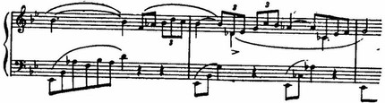 В первом ее разделе происходит сильнейшее драматическое нагнетание. Все приемы развития сосредоточены на том, чтобы выявить и подчеркнуть драматические стороны музыкального образа. Но в кульминационный (для начального раздела разработки) момент вместо собирания, суммирования драматических элементов главной темы появляется — в совершенно новом обличье — побочная тема: