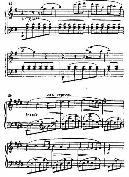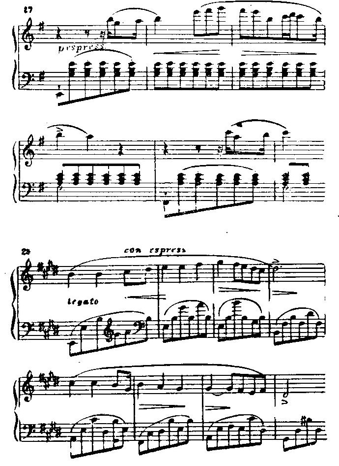 Их создает целый ряд факторов. Во-первых, спокойное движение, обыгрывание выразительных изгибов. Весьма характерен, например, ход g-fis-e-h в тактах 2-3 из примера 27 (представляющий обращение „шопеновского мотива" Микетты). Такое излюбленное романтиками, особенно славянскими, движение с терции тоники на ее основной тон и затем скачок вниз на квинту носит в мажоре светлый, а в миноре печальный, в обоих случаях — ласково убеждающий, молящий характер. Во-вторых, задержания и непрестанное подчеркивание терций и квинт аккордов (а не их основного тона) (Известно пристрастие романтиков к окончанию пьес тоникой в мелодическом положении терции или квинты (а не основного тона) с целью придать и заключительному аккорду неполную устойчивость, „устремленность". Из произведений Шопена многие оканчиваются в мелодическом положении терции и меньшее число — в положении квинты.). Это способствует романтической томительности, неопределенности. Соответственно применены и гармонические средства, прежде всего аккорда из двух малых и одной большой терций, роль которого в первой части e-moli'ного концерта очень велика.