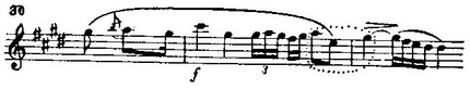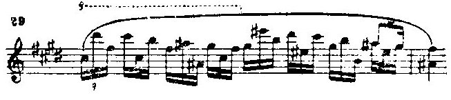 В мелодии и гармонии E-dur'ного периода слегка намечаются интонационные моменты несравненного этюда ор. 10 № 3. Ломаный пассаж триолей (пример 29) дает образец шопеновской мнимой полифонии (спускающийся гаммовый ход верхнего мнимого голоса):