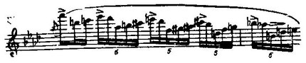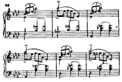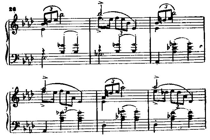 Есть в первой части концерта и простые заимствования: так, например, такты 5-6 экспозиции оркестра совершенно напоминают такт 16 и последующие первой части сонаты Вебера ор. 70, сочиненной в 1822 году (это место из сонаты Вебера заставляет вспомнить также о начале первой части концерта e-moll). Дальше (такты 17-18) появляются почти реминисценции побочной темы увертюры к „Фрейшютцу". Что касается многотемности экспозиции оркестра, то она — от многотемности соответствующих разделов концертов Гуммеля.