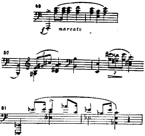 Здесь Шопен превосходно использует образные средства, завоеванные еще этюдами ор. 10. Это — выделение и контрастирование интонаций сурово-мрачных (пример 49) и триумфально-победных (примеры 50 и 51):
