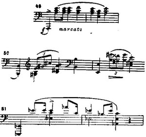 Примечательно заключение — отнюдь не депрессивное, но утверждающее — с блестящим, речитативно-фанфарным подъемом четвертей из недр контроктавы к gis третьей октавы — звонкой терции тоники.