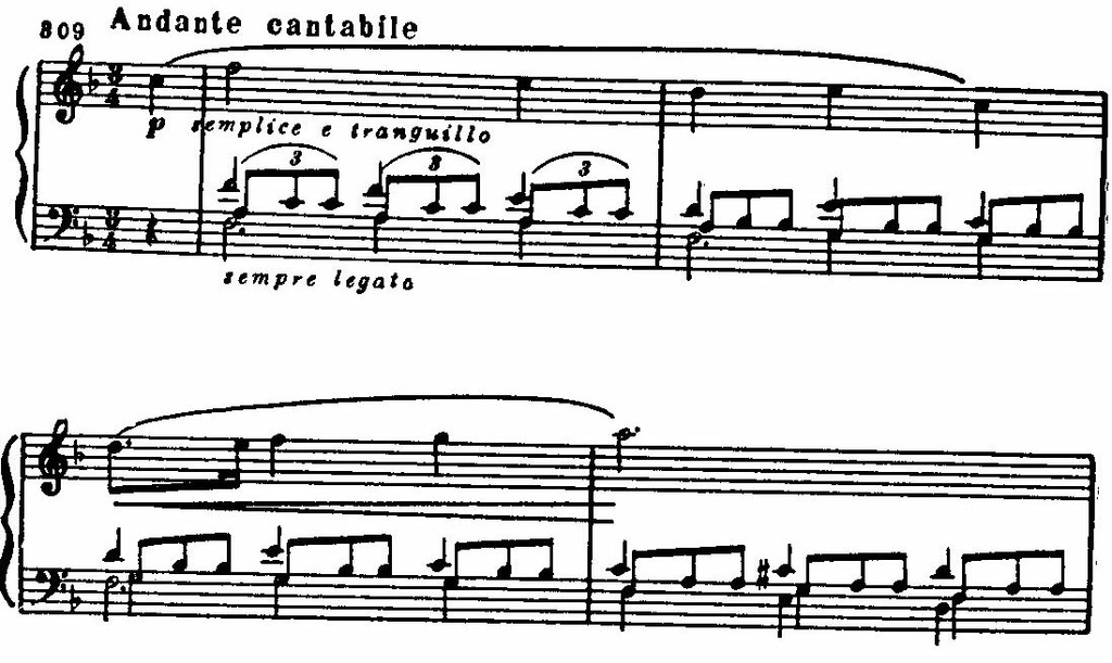 Песенно-плавной, заключенной в небольшой диапазон диатонической мелодии вторит один из средних голосов. Этот своеобразный дуэт сопровождается выдержанными или поступенно опускающимися звуками баса, на которые опирается мягкое покачивание триолей: