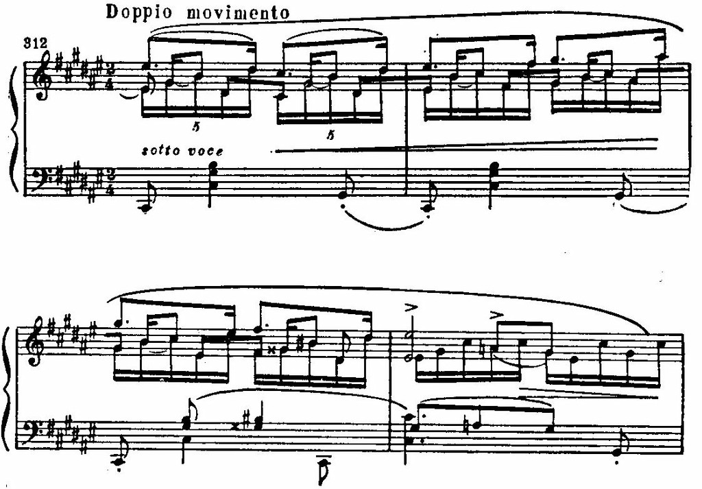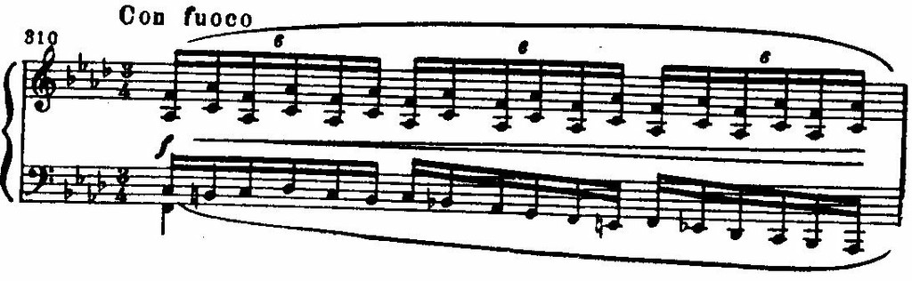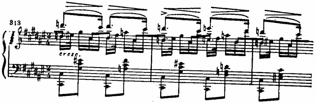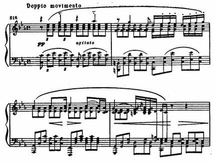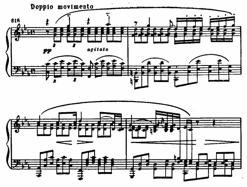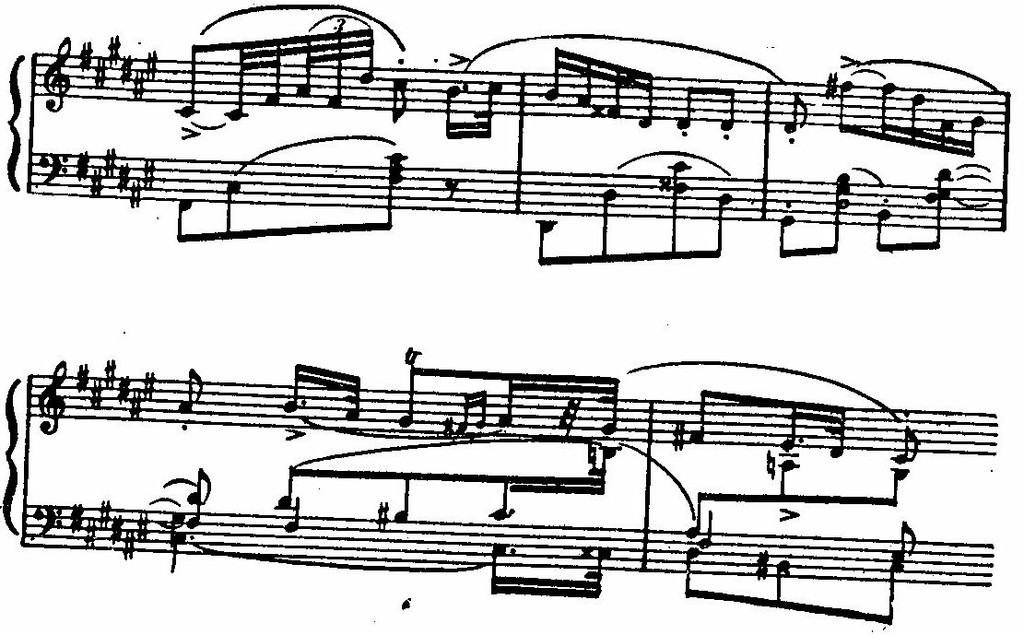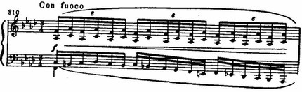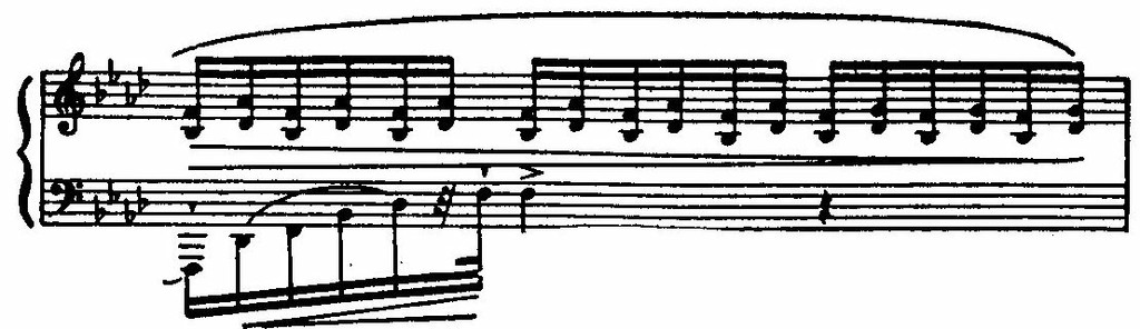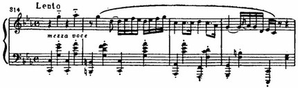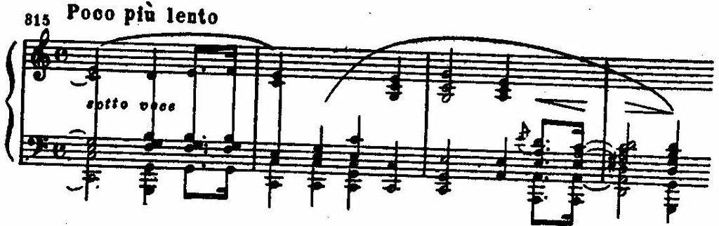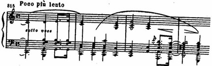 Кульминация выражена терпким диссонантным звукосочетанием: наложением VI пониженной ступени на доминантсептаккорд, подчеркнутой резкостью полутонового задержания: