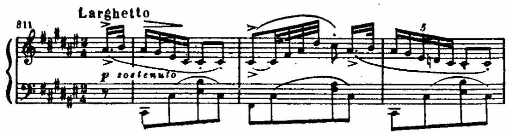 Расположение мелодии в среднем регистре, ее густая тембровая окраска, полнозвучие гармонического сопровождения образуют насыщенную фактуру, как нельзя более соответствующую сдержанно-страстному характеру музыкального образа.