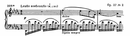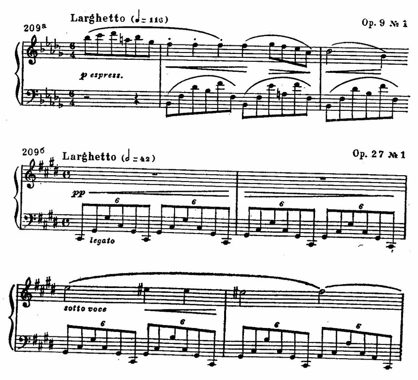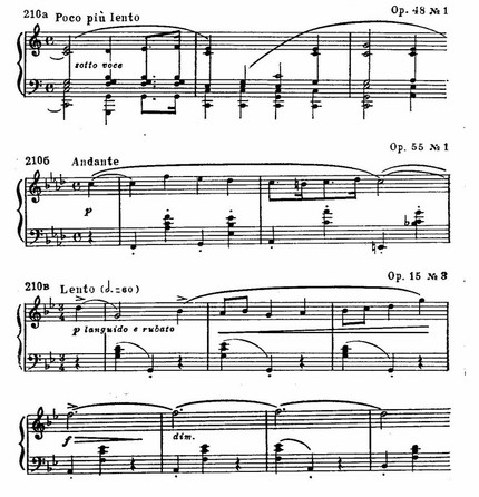 Однако фортепианный аккомпанемент ноктюрнов ни в какой мере не воспроизводит оркестровый стиль. Наоборот, нигде так не подчеркнут, так последовательно не проведен «фортепианно-обертонный» принцип шопеновского пианизма, как в его ноктюрнах. Кантиленная мелодия, как правило, показана на аккордово-фигурационном педальном фоне, который с первых звуков произведения вводит слушателя в мечтательную романтическую атмосферу: