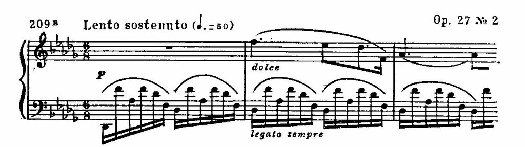 В этом ноктюрне изложение и развитие темы более сложны и утонченны, изысканней весь ее силуэт. В ритмическом узоре мелодии капризно свиваются разные повороты: плавный спуск, чередующийся с порывистым взлетом, квинтоль с неожиданно ярким интонационным ходом на увеличенную секунду, призывно-пунктирные интонации затакта, томная медлительность повторяющегося звука доминанты: