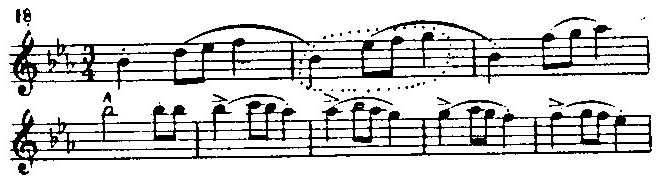 Обыгрывание и орнаментирование гаммообразного хода в данном примере особенно рельефны, но аналогии встречаются у Шопена постоянно (Кстати сказать, обведенный нами на примере оборот очень любим Шопеном (в мажоре и миноре). Я. Микетта даже назвал его „шопеновским мотивом"). „Стилизованная гамма" — одна из характернейших черт детальности, антидекоративности и напевной плавности мелодического стиля Шопена. Ор. 18 начинает серию аналогичных блестящих салонных пьес в форме вальса, который из числа не польских танцев более всего привлекал внимание композитора. Уже в вальсе ор. 18 очевидна содержательность шопеновского „салона". Это — „легкая музыка" в лучшем значении слова, музыка живых, подвижных, порою кокетливо-переменчивых, но отнюдь не пустых или лицемерных эмоций.