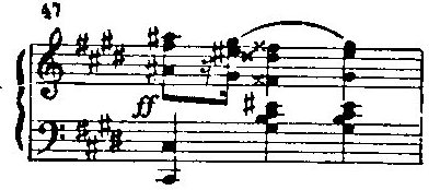 Мазурка Oр. 30 No. 4, до-диез минор. Это одна из „мазурок-поэм". Контрасты напряженно печальных и блестяще мужественных интонаций очень ярко выражены. Повсюду, даже в ласковой любовности H-dur'ной темы, чувствуется мучительная тревога. В конце, после ряда кульминаций, типичный плагальный „каданс спада", затихающий в низком регистре. Тональный план (cis—Е—cis—gis—cis—gis—H—dis—H... cis—E—cis) указывает на объединение минора и параллельного мажора. Порою мелодические ходы обусловливают смелые столкновения; такова гармоническая резкость такта 73 и др.: