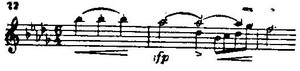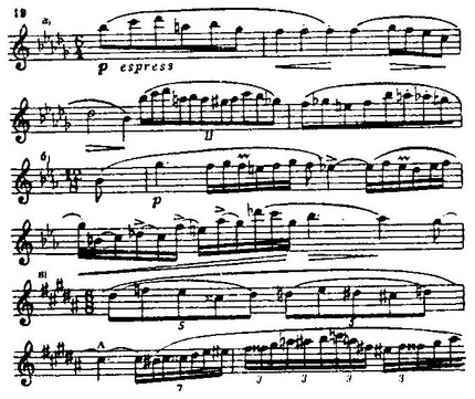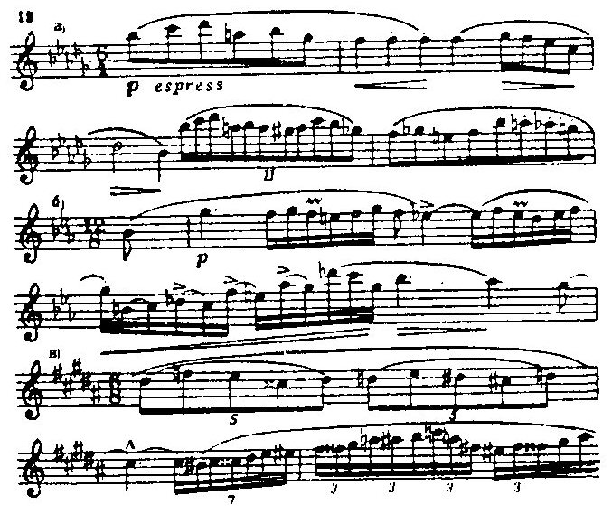 Перед нами все те же хроматические обыгрывания. В затакте первой мелодии звуками с, а и ges обыгрываются звуки тонического трезвучия b-des-f; во втором такте второй мелодии звуками h-des-f-as обыгрываются звуки восходящего доминантсептаккорда f-moll; в первом такте третьей темы хроматическое обыгрывание звуков мелодии столь извилисто, причудливо и изобильно, что приводит к противоположности — не подчеркиванию, а вуалированию мелодических контуров.