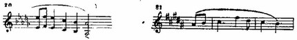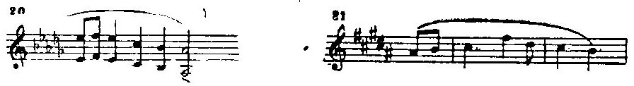 Обзор интонаций ноктюрнов ор. 9 (как, впрочем, и любого произведения Шопена) разбивает лишний раз теории о существовании двух изолированных групп („национального" и „интернационального") в шопеновском творчестве. Так, характерная попевка второй темы ноктюрна b-moll (пример 20) оказывается весьма сходной с народной попевкой куявяка из фантазии ор. 13, а мелодический оборот из ноктюрна H-dur (пример 21) оказывается идентичным с главной темой краковяка ор. 14, выдержанной в духе фольклора: