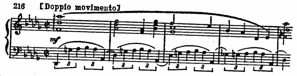 Наконец, аскетически суровые, мощные звучания «Похоронного марша», свободные от каких-либо элементов орнаментальности и камерного изящества, определили не совсем обычный облик пианистической фактуры всей сонаты. Элементы камерного пианизма с характерным педальным фоном, сконцентрированы исключительно в тех кратких «ноктюрнообразных» эпизодах, которые образуют контрастный элемент к драматически бушующей реальности (см. пример 216 и трио из «Похоронного марша»). Кажется, что в сонате нет ничего, что уводило бы в сторону от кардинальной темы, выраженной с программной рельефностью в «Похоронном марше».
